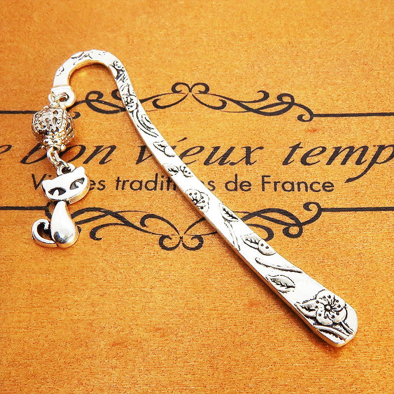 - アンティークシルバーの猫モチーフとメタルビーズの可愛いブックマーカー 栞 しおり 花柄模様