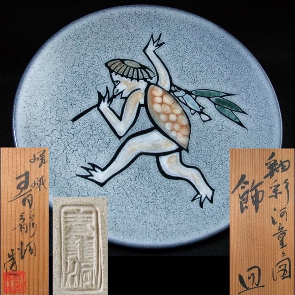 - 勝尾青龍洞造 釉彩河童之図 飾り皿 幅:21cm 信楽焼 美品・共箱/21d073