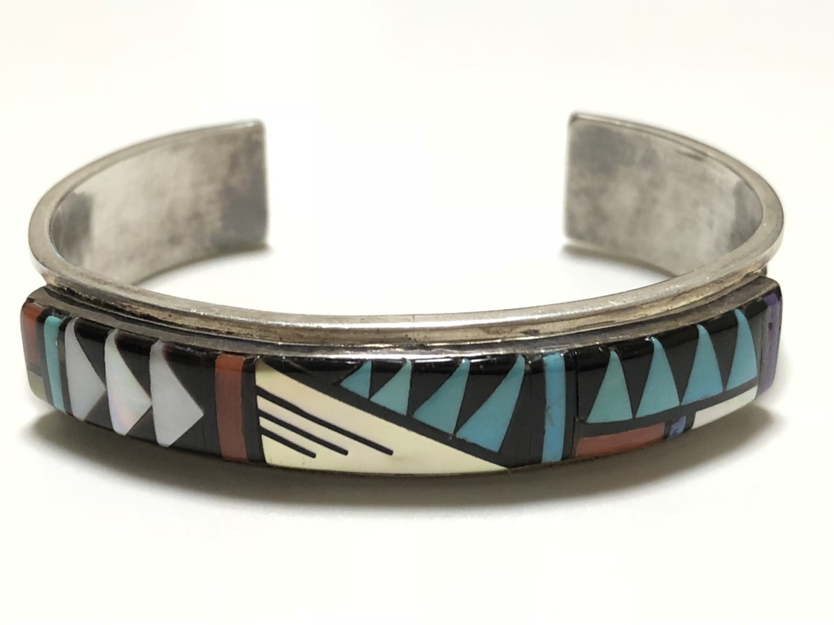 > インディアンジュエリー ズニ族 ターコイズ コーラル オニキス シェル SILVER 17.6g 作家物 N.M インレイ バングル