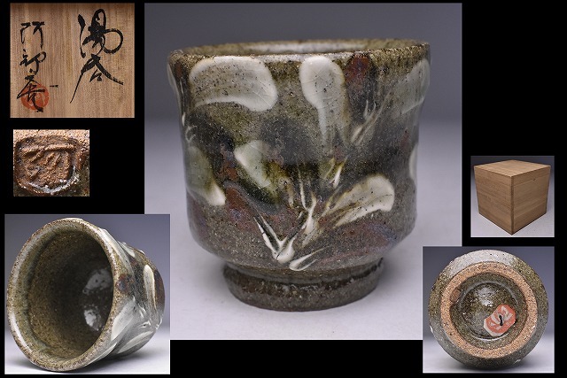 - 阿部文貴 ★ 益子焼 湯呑 ★ 共箱 ★ イッチン風 鉄絵 草文★ 丁寧で見事な景色の逸品 ★