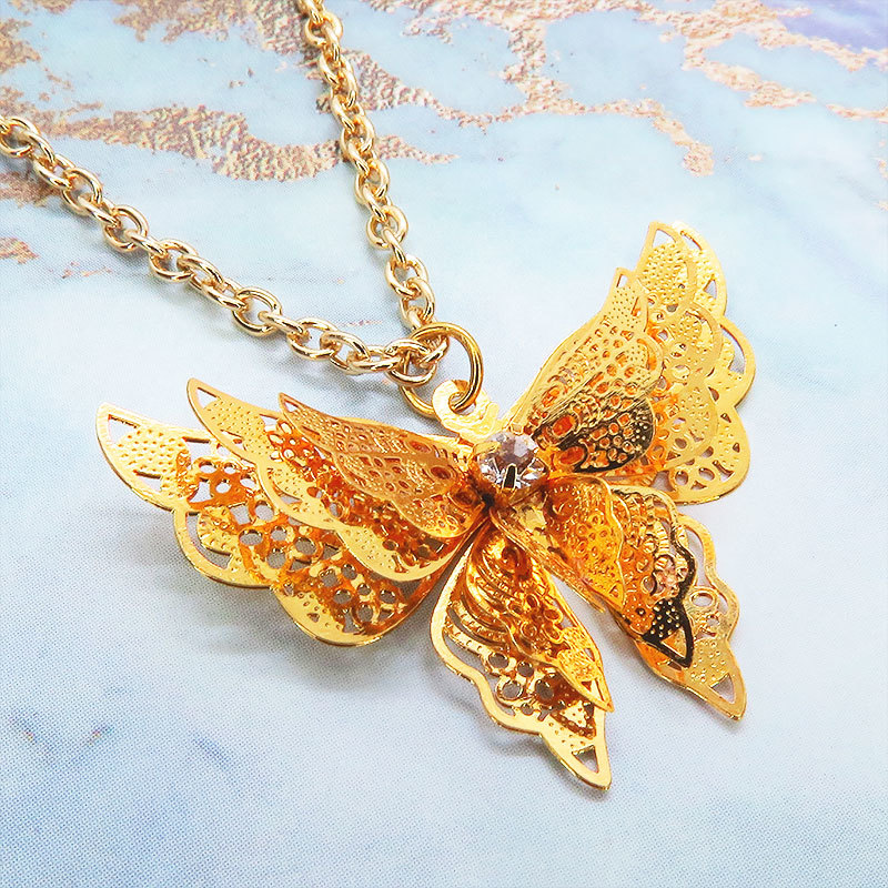 > ゴールドカラー バタフライ ペンダント ネックレス 繊細なつくりで立体的に表現された蝶 立体 ラインストーン 3D かわいい 可憐