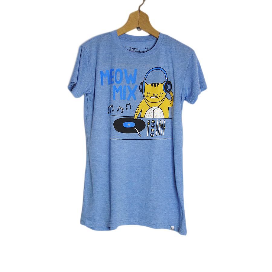 > 新品 レディース Tシャツ 新品 プリントTシャツ デッドストック Lサイズ MEOW MIX 猫のDJ New Standard 水色 #2503