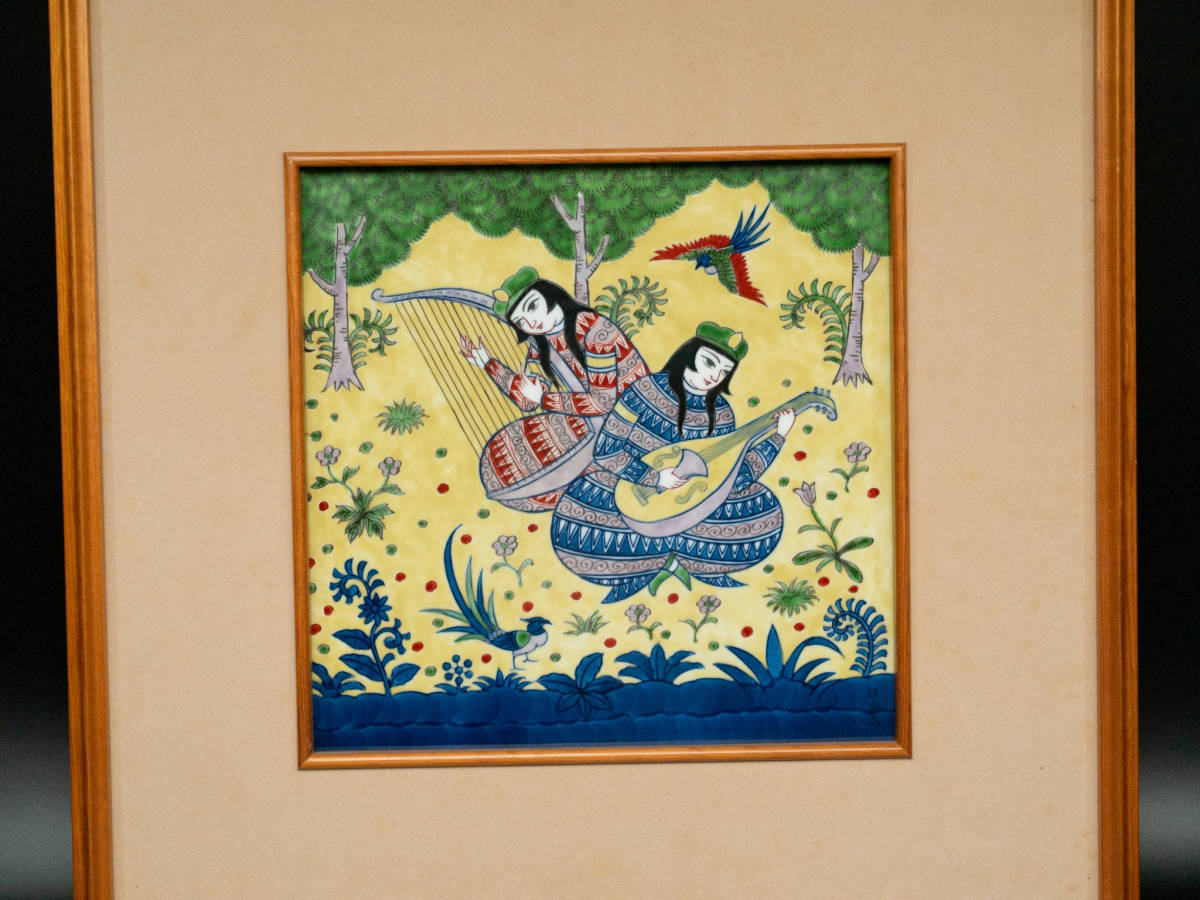 > 【値下げ交渉有り】 館林源右衛門 造 色絵 ミナイ手 樹下人物文 陶板 額装付 共紙箱