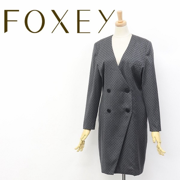 > 美品◆FOXEY BOUTIQUE/フォクシー ブティック ドット柄 ダブル ノーカラー コート チャコールグレー 40