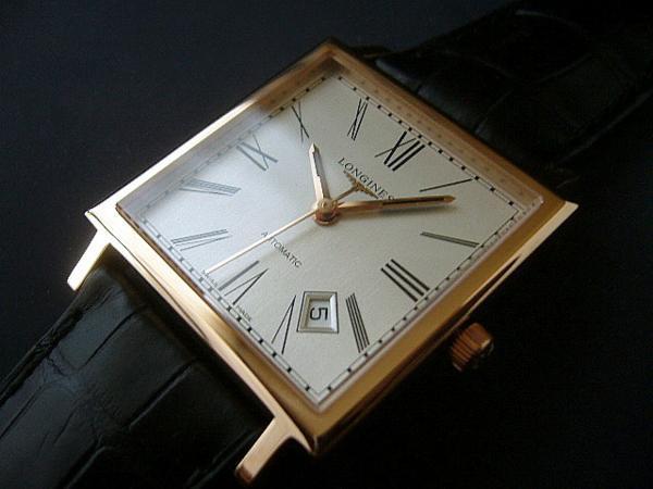 ~~~ロンジン◆自動巻◆ピンク18金無垢◆ヘリテージ1968◆最新モデル(新品)!!~~~◆出品はLONGINES HERITAGE1968(ロンジンヘリテージ1968)、18金ピンクゴールド無垢(K18PG)製紳士用自動巻腕時計です。2012年ロンジンミュージアム開設180周年を記念して素晴らしい展示品のひとつである1968年に製造された、スクエアの時計からインスピレーションを得て製作されています。国内では2014年2月スォッチグループジャパンにより販売された最新現行モデルですが正規代理店では販売完了(デッドストックモデル)となってマニア垂涎のロンジン最高級機種アイテム(レアモデル)です。L2.792.8.71.0。新品未使用2年間保証付(正規代理店扱い新品)。定価1,017,500円(税込)。付属品:ロンジン国際保証Gカード【落札後2年間メーカー保証付】&取り扱い解説冊子、タグ、ロンジン純正時計Box&外箱付。◆特長:18金ピンクゴールド製スクエア型の紳士用自動巻腕時計です。国内では昨年発表されたばかりの最新モデル(新品)です。グレーの文字盤にはブラックの細長いローマ数字がペイントされ、外側にチャプターリングが配されています。分針と時針は細く、ブラック光沢塗装が施され、数字のラインと同調する形で繊細なコントラストを成しています。スクエアのケースの外観はクラシカルな印象ですが、最新技術に裏打ちされたボックスサファイアガラスが他にはない特徴です。また、台形の日付表示部分が新鮮でアバンギャルドな印象を与え、かっちりとしたケースのシルエットとコントラストを成しています。ロンジン純正自動巻ムーブメント(キャリバー L619メカニカル自動巻ムーブメント. 21 石, 28'800 振動数/時, パワーリザーブ 42 時間 )を搭載し、エレガントなブラックアリゲーターストラップが取り付けられています。33mm(ラグ除く)×33mm(竜頭除く)、厚み約10mmとスクエアモデルではそれなりに大きく重量の約74gと存在感充分な角型モデルです。