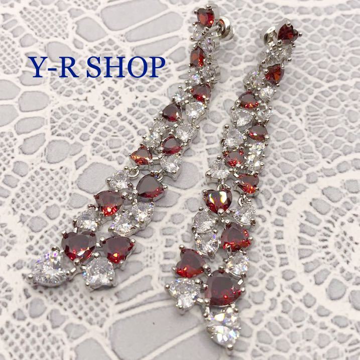 > ガーネットとホワイトトパーズのハートデザインゴージャスピアス★レディースシルバーアクセサリーカラーストーン ロングゆらゆら新品Y-R