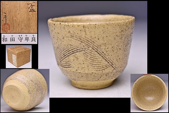 > 和太守卑良 ★ 灰釉 線彫り ぐい呑 ★ 共箱 栞 ★ 独特の作風が人気のある作者の初期の逸品 ★ 笠間焼 ★ 和田守卑良