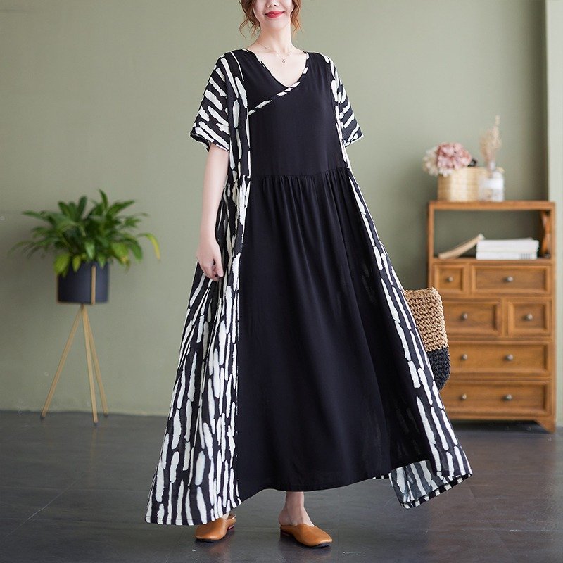 - ZJM1053 体型カバー*Vネック切り替え*半袖マキシロングワンピース*新品春夏*レディース*カジュアル*大きいサイズ