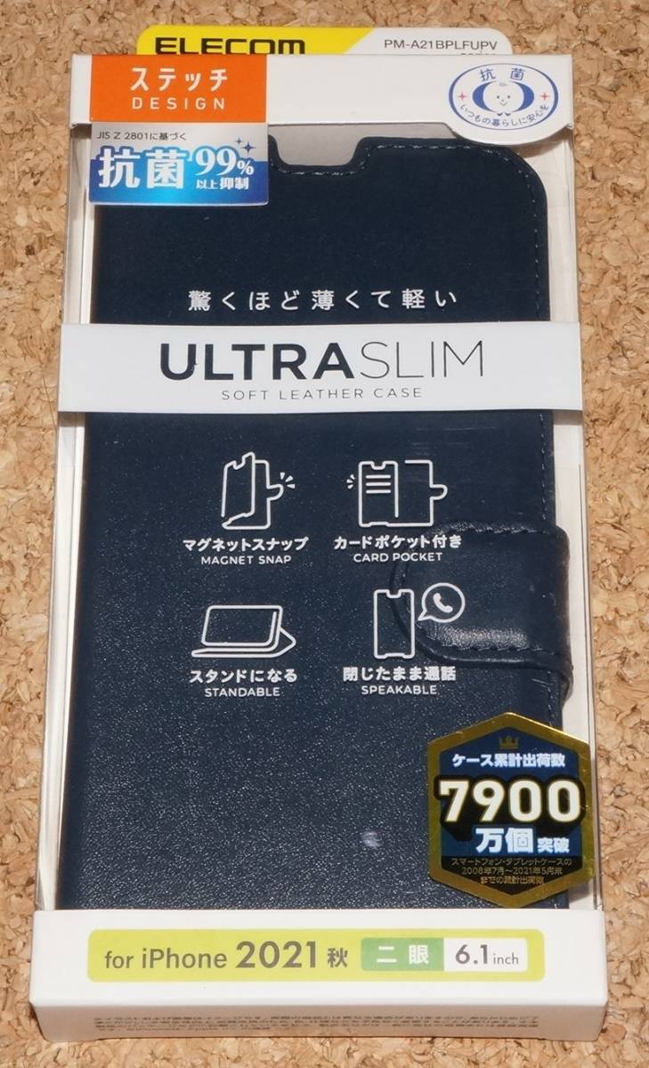 > ★新品★ELECOM iPhone13/14 レザーケース Ultra Slim ステッチ 抗菌 ネイビー