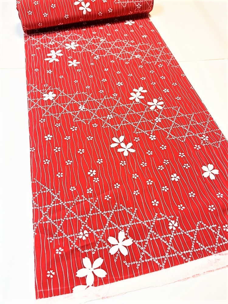 - 花とら●リサイクル 反物 未カット 小紋 赤 桜 立涌 リメイク 素材 和裁 練習にも 220915