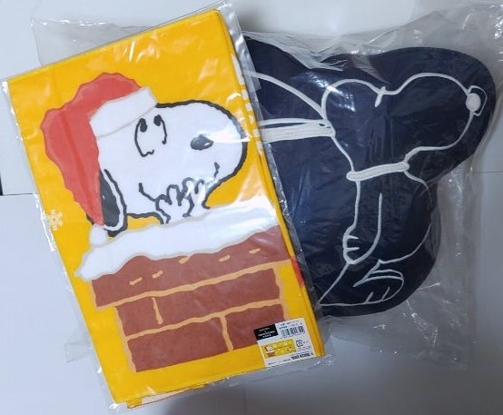 - Snoopyコラボ絶版品2点セット①×タワレコ タオル クリスマス柄 ORANGE 2017年+②×ユニクロ クッション NAVY 2021年※未開封品/未使用品