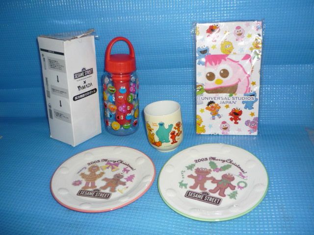 - D★非売品・未使用★2003年ミスタードーナツ×セサミストリート クリスマスプレート2枚と湯呑み他5点