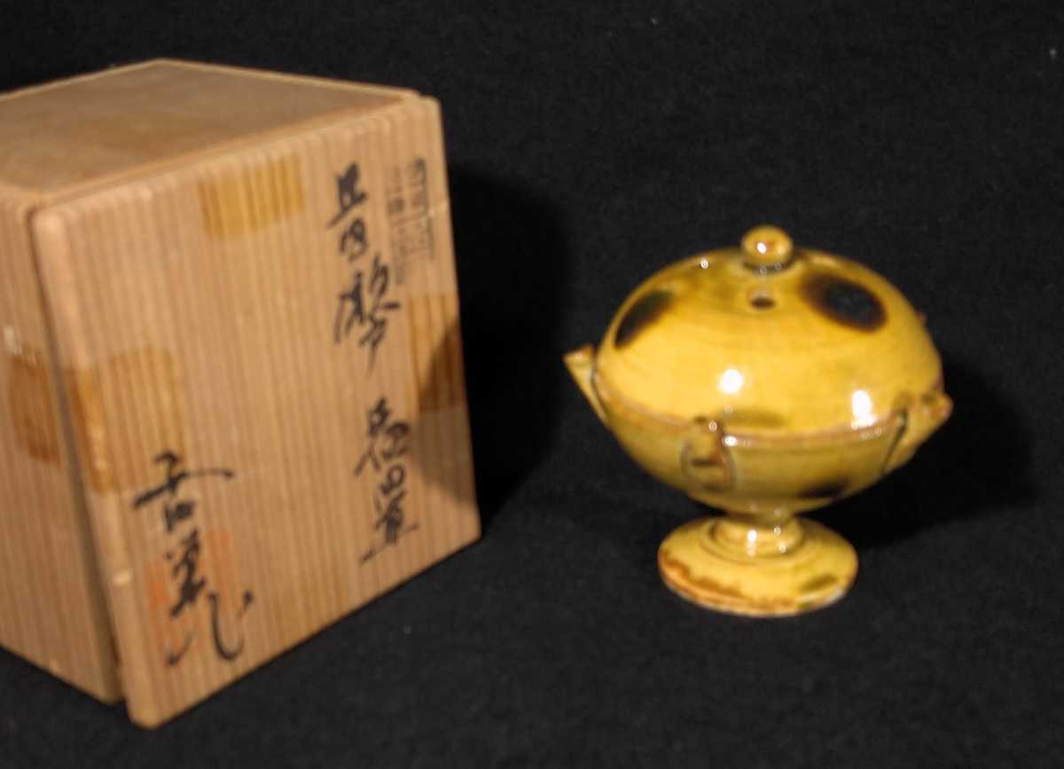 - 京焼 孟義 「黄瀬戸蓋置」 黄瀬戸 ユニークな香炉形 蓋置 共箱 茶道具 bdo-21a2505