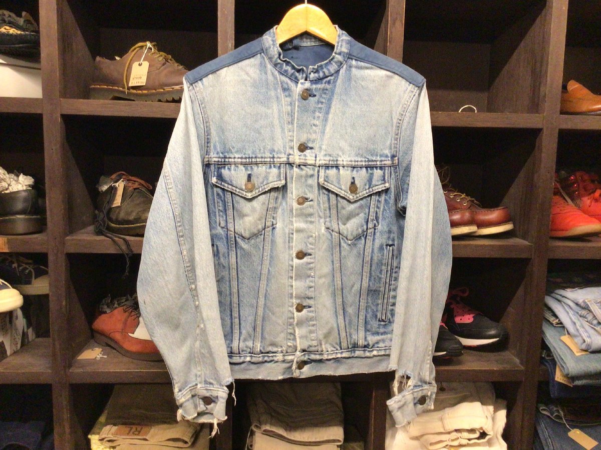 > MADE IN USA REMAKE PLAIN POCKET NO COLLAR DAMAGE DENIM JACKET SIZE 38 アメリカ製 リメイク ノーカラー ダメージ デニム ジャケット