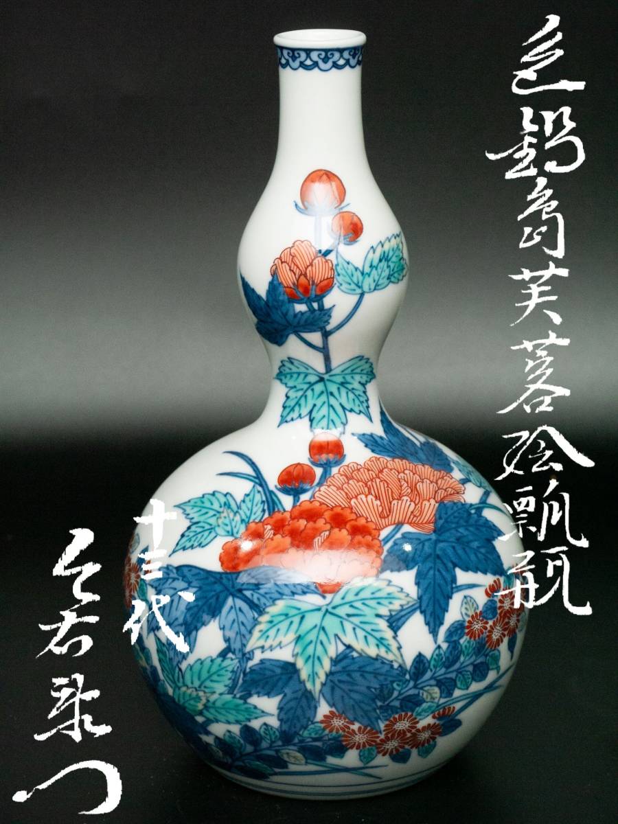 > 【値下げ交渉有り】 人間国宝 十三代 今泉今右衛門 本人作 色鍋島 芙蓉絵 瓢型 花入 花瓶 共箱