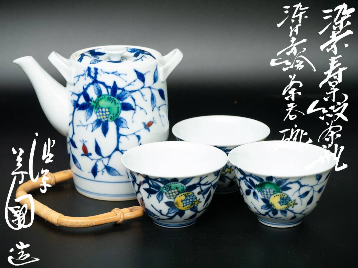 > 【値下げ交渉有り】 渋草 芳國舎 芳国舎 造 染赤 寿果文 柘榴 急須 湯呑 茶器揃 計四点 共箱