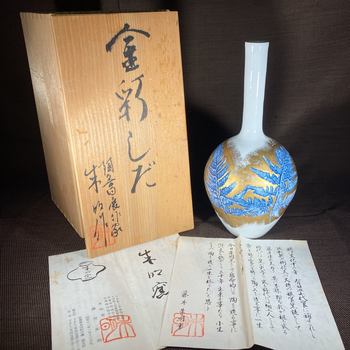 - 藤井朱明造 金彩しだ 花生 共箱 八八八