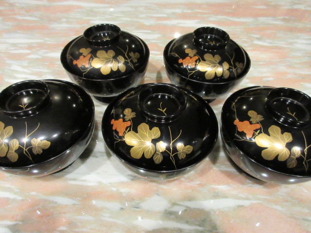 - お椀 5客組 蓋つき 蔦と赤い実模様 塗り物 黒