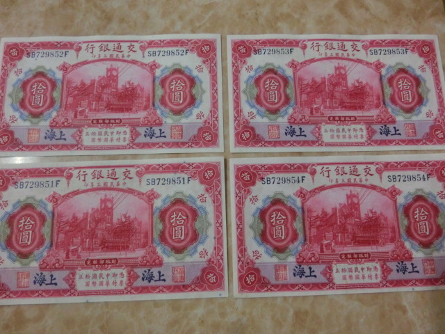 - ★ 交通銀行 拾圓 1914年 未使用~準未使用・連番 4枚セット ★ No.1