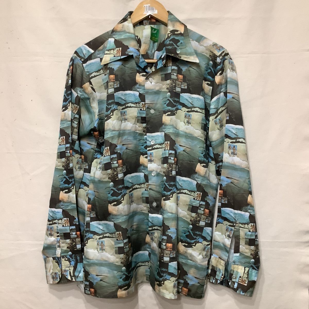 - H65、ビンテージ70年代ポリシャツフォトプリントサーフビーチ西海岸長袖シャツ 総柄珍品レア物希少サイズM