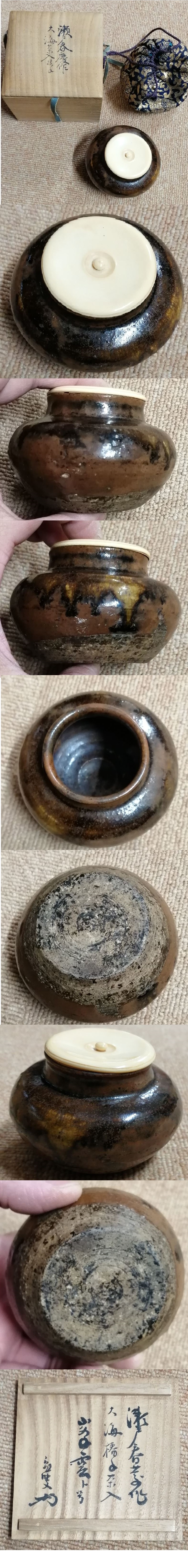 - 保証品 江戸末期 古瀬戸 藤四郎 春慶 作 大海 茶入 表千家 堀内家 七代 至慎斎 宗晋 亀叟 鑑定 箱 茶道具 古裂