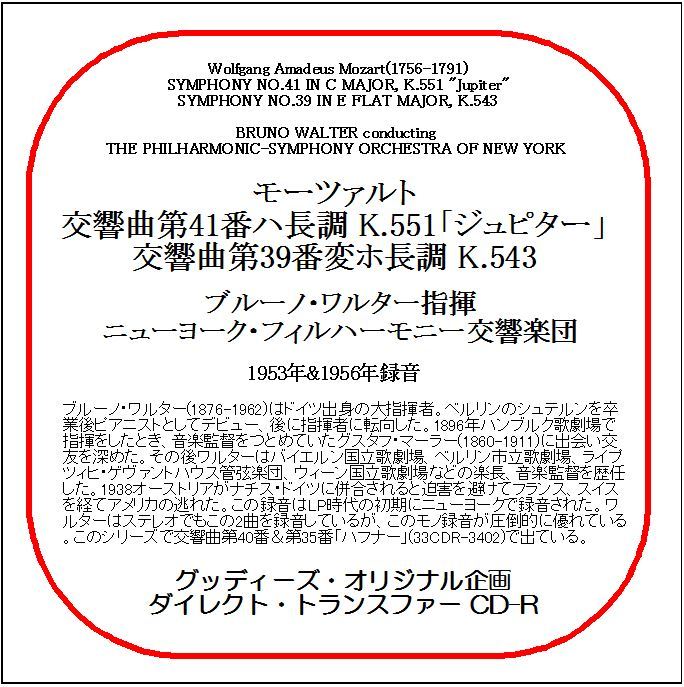 - モーツァルト:交響曲第41&39番/ブルーノ・ワルター/送料無料/ダイレクト・トランスファー CD-R