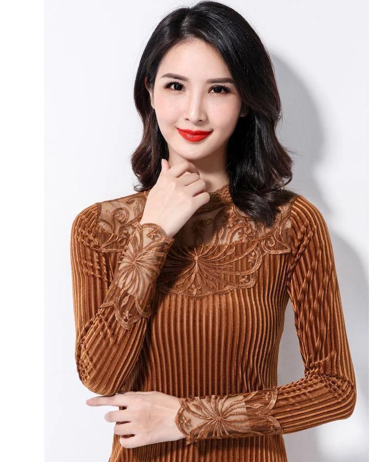 - 【キャメルブラウン・M】レディース 長袖 トップス 花柄レース ベルベット