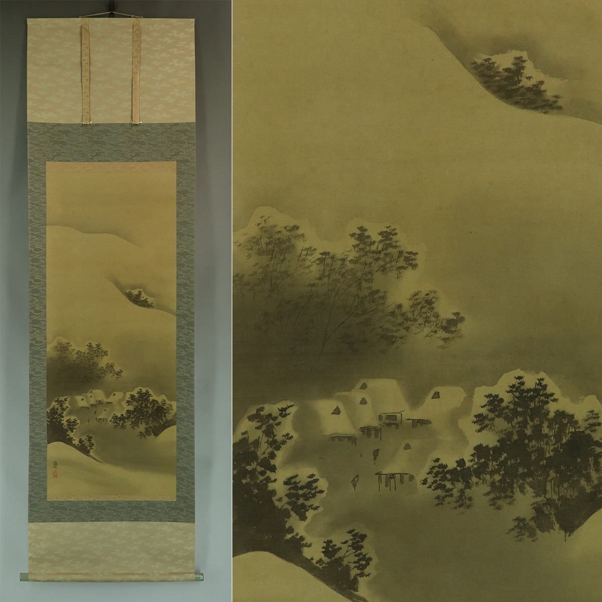 - 【真作】橋本雅邦【田家雪景図】◆絹本◆合箱◆掛軸 u10051
