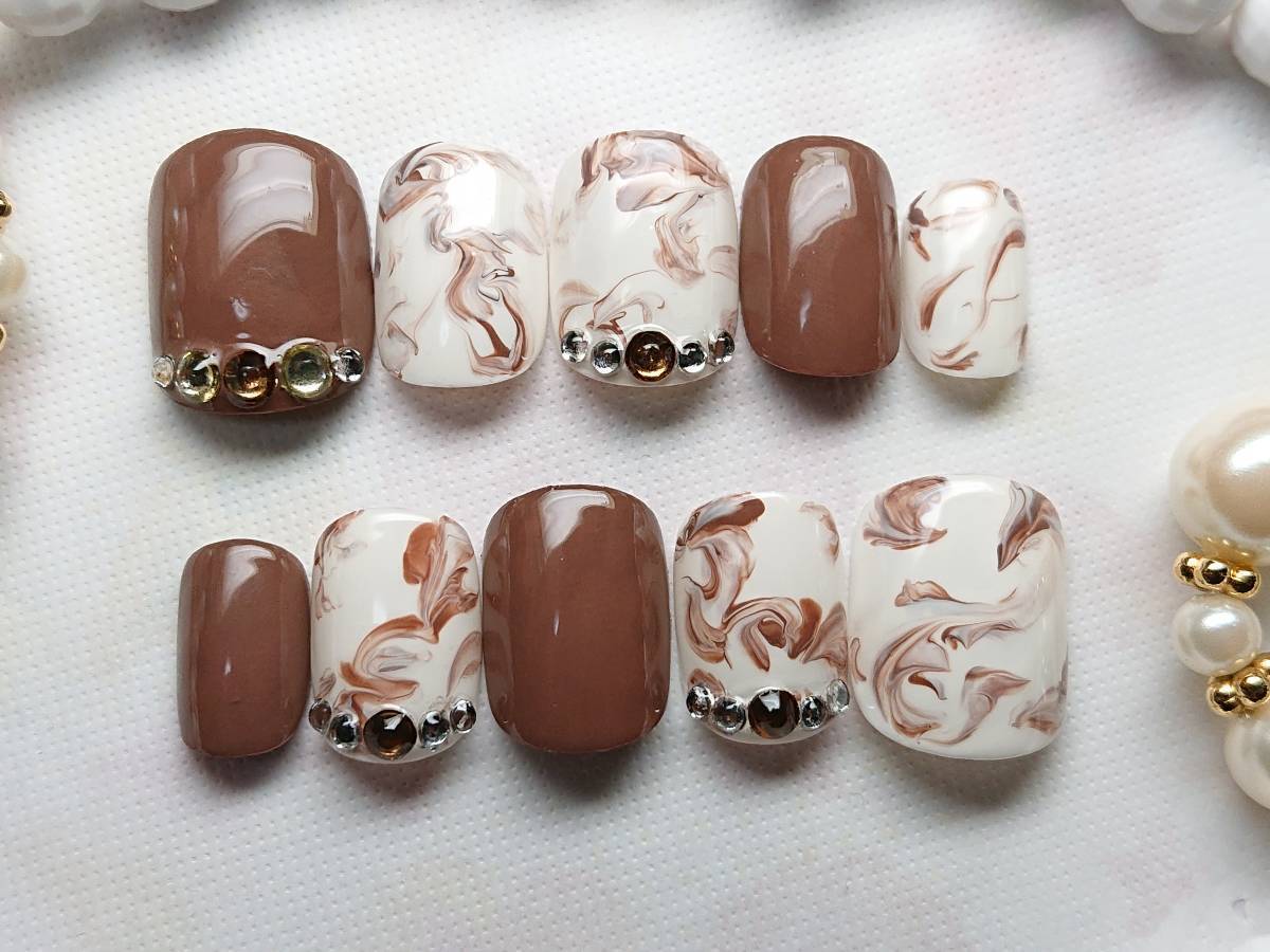 - 即決☆ジェル加工済ネイルチップ☆ベリーショートS モカベージュマーブル