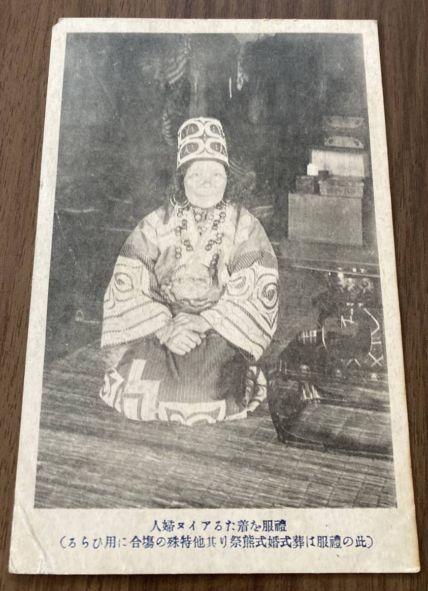 - レトロ・アイヌ関係絵葉書 礼服を着たるアイヌ婦人(此の礼服は葬式婚式熊祭り其他特殊の場合に用いらる)