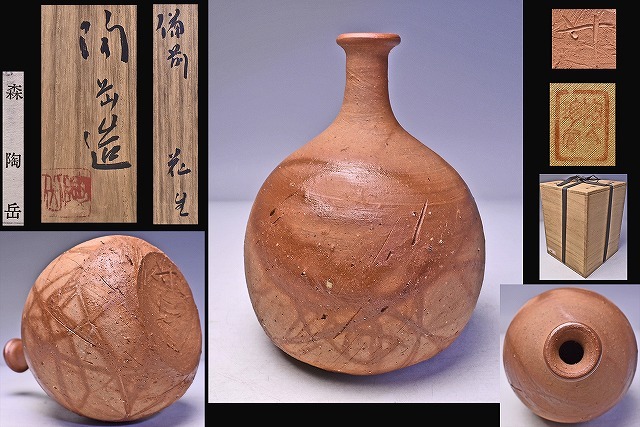 > 森陶岳 ★ 備前 緋襷 花生 ★ 共箱 共布 栞 ★ 氏の轆轤技が堪能できる美しい緋色の初期の逸品 ★ 華道具 ★ 古備前写 ★ 検 森一洋 森千晃