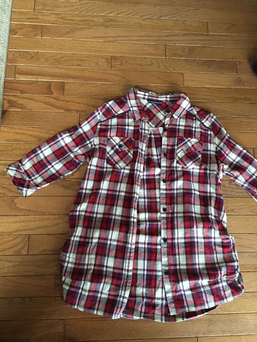 - ★送料無料!★赤のチェック★脇シャーリング★丈長めのシャツ★七分袖★2way★柔らか素材M