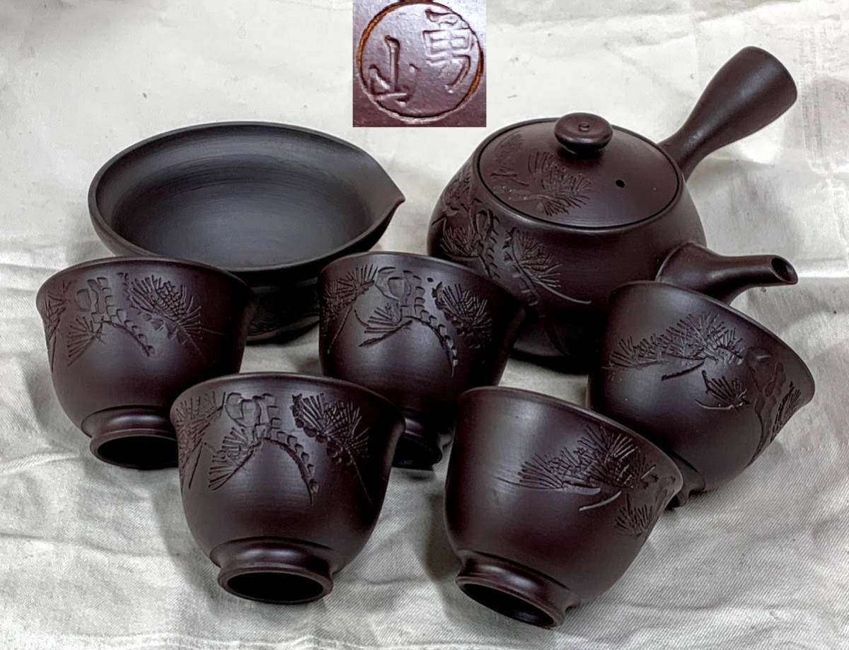- 年代物伝統工芸士 出口勇次郎 勇山 在銘 四日市 萬古焼 手作り 釘彫 松木吉祥紋 煎茶器揃 急須 湯冷 湯呑 7点 箱無 used 未使用 経年保管品