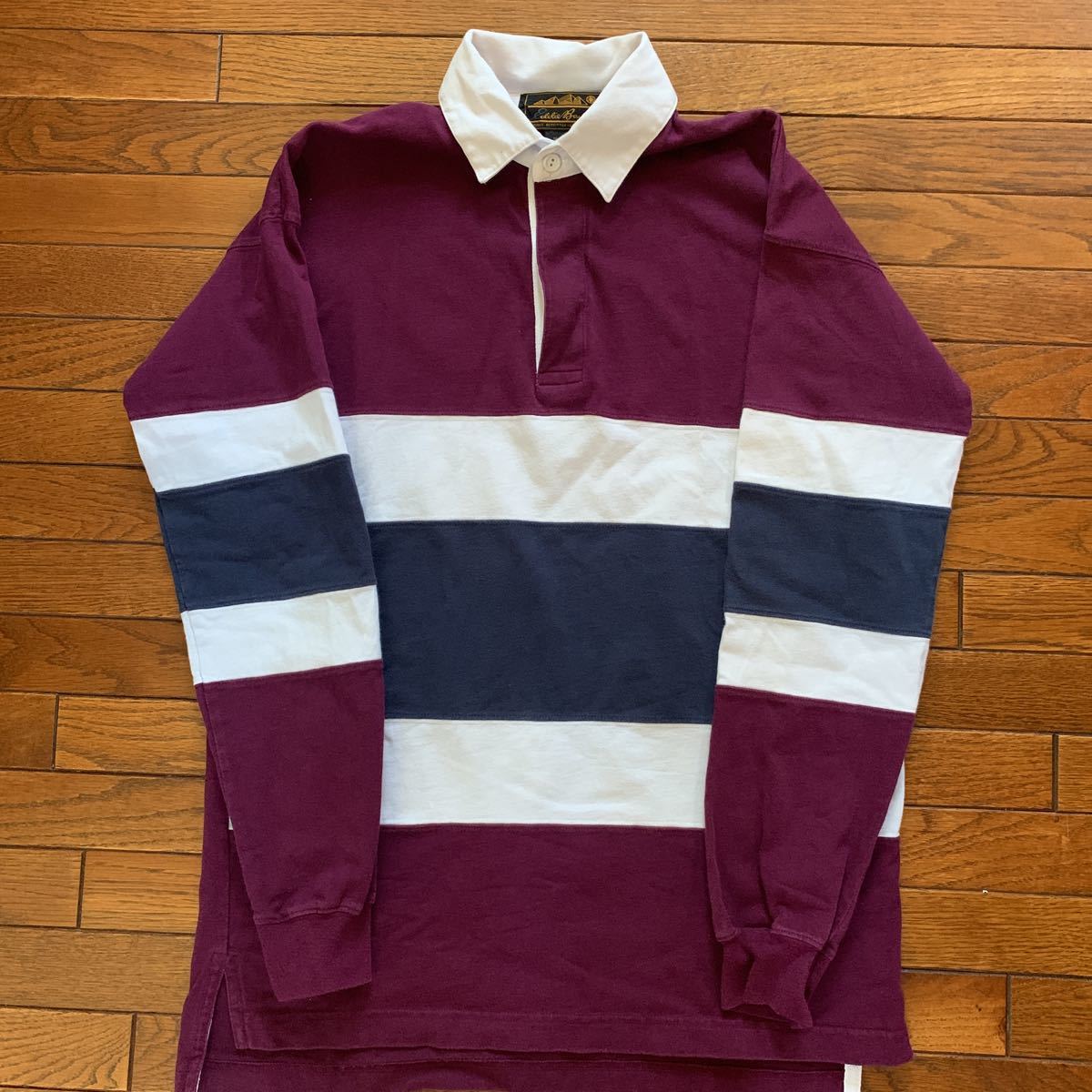 - 90s【Eddie Bauer】エディーバウアー ボーダー 長袖ラガーシャツ 黒タグ Sサイズ 古着 vintage スリランカ製