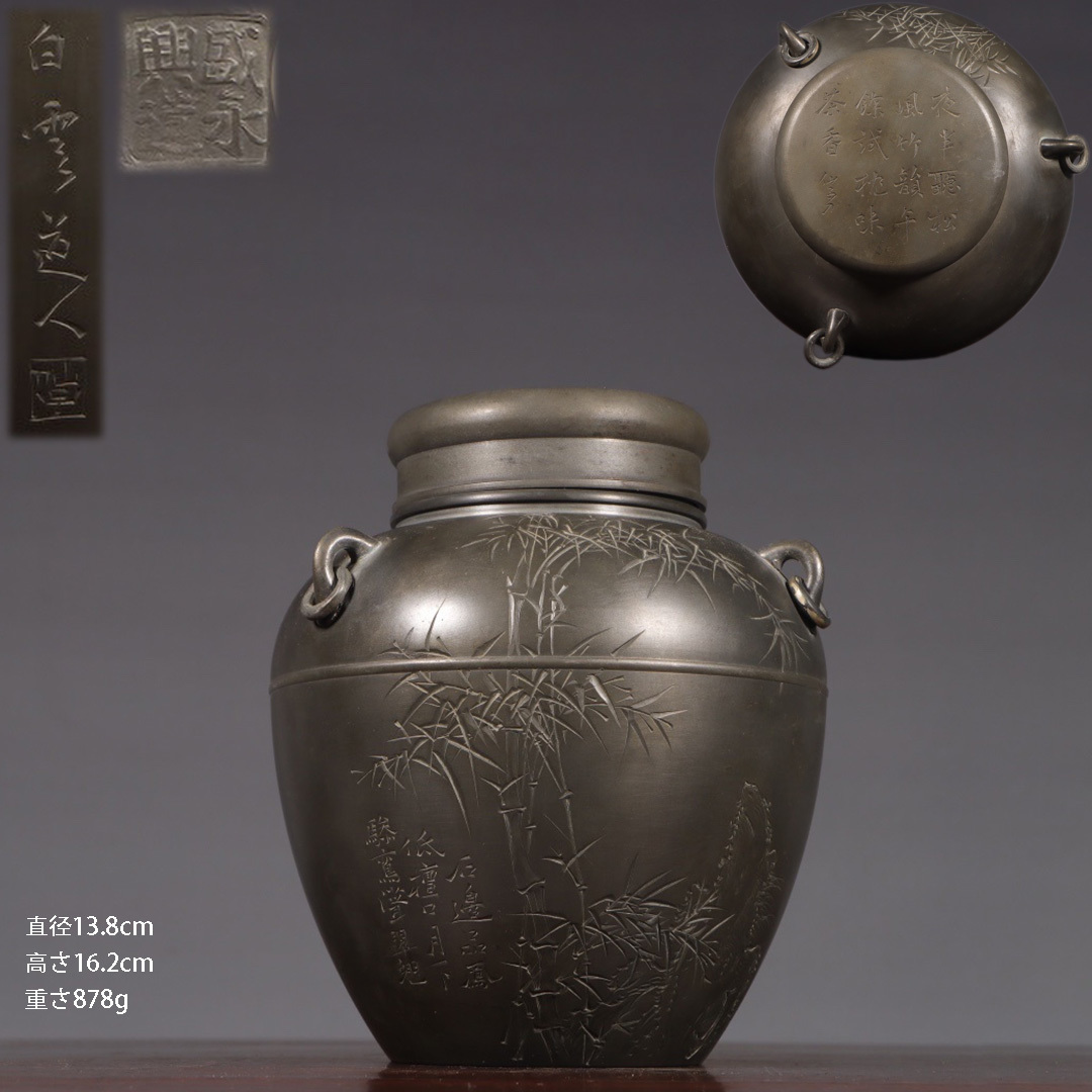 - 古錫 茶葉罐 盛永興造 「錫刻竹石詩文図茶心壺」 茶筒 茶入 茶壷 茶道具 純錫 時代物 LT-05242