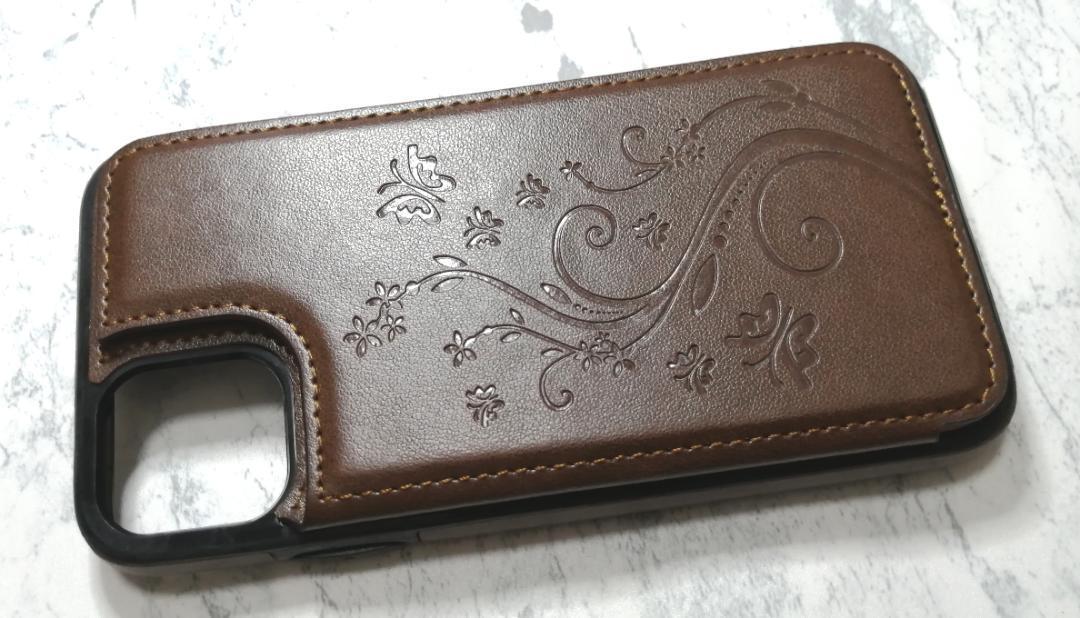 - 手帳型 カード入れ付 iPhone11用 ケース 蝶 草花 ブラウン茶色