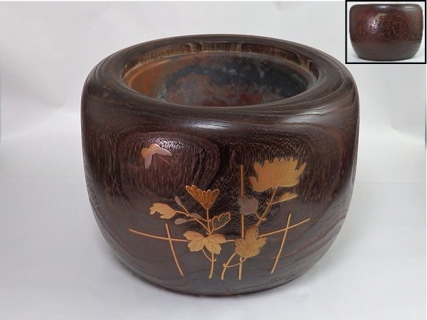 - fbna-D705mS 金蒔絵 梨地に螺鈿 竹垣に菊の図 桐火鉢