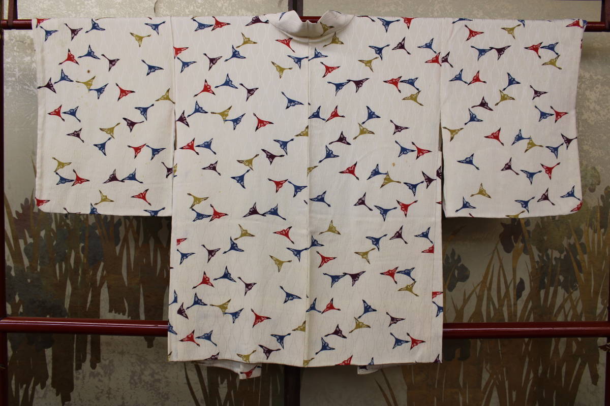 - きもの今昔5255 お羽織コレクション 正絹たて枠地紋地に白地色に四色の飛び鶴の柄 身丈77cm