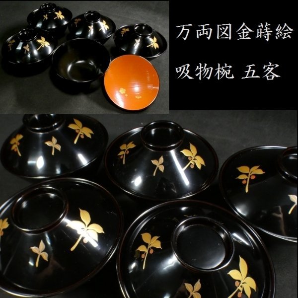 【 恵 #0651】 可愛らしい小吸物椀 五客 万両図金蒔絵 保管箱あり 2 漆器 検:茶道/茶道具/漆芸品拍卖