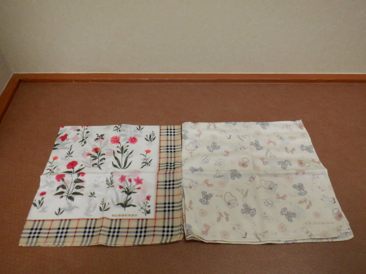 - C5『BURBERRY(バーバリー)ピンクの花柄模様のハンカチ&CLATHAS(クレイサス)雑貨柄のハンカチ~2枚まとめて』