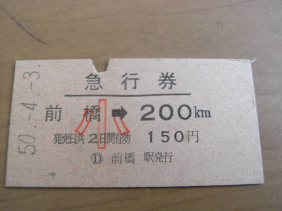 - 急行券 前橋→小200km 昭和50年4月3日 前橋駅発行