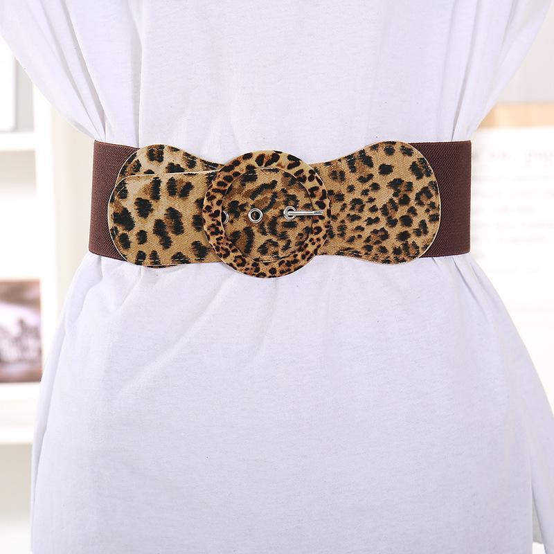 - 【ヒョウ柄】ラウンド ピンバックル 幅広ゴムベルト フェイクレザー