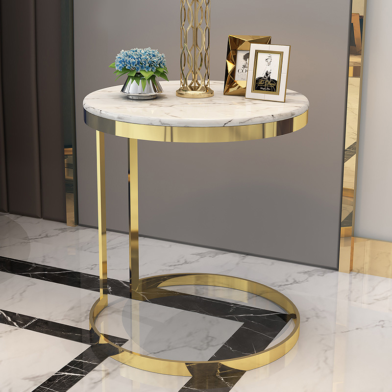 > 大理石とチタンゴールドの丸いサイドテーブル コーヒーテーブル 高級感のある天板 ゴールドの脚 ホワイトベースのテーブルトップ