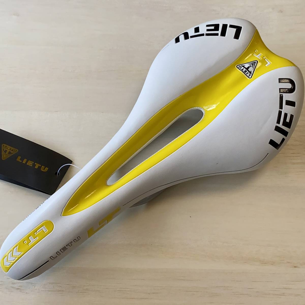 - 自転車サドル スポーツバイク仕様 薄型 ホワイト黄ライン【匿名配送 送料無料】