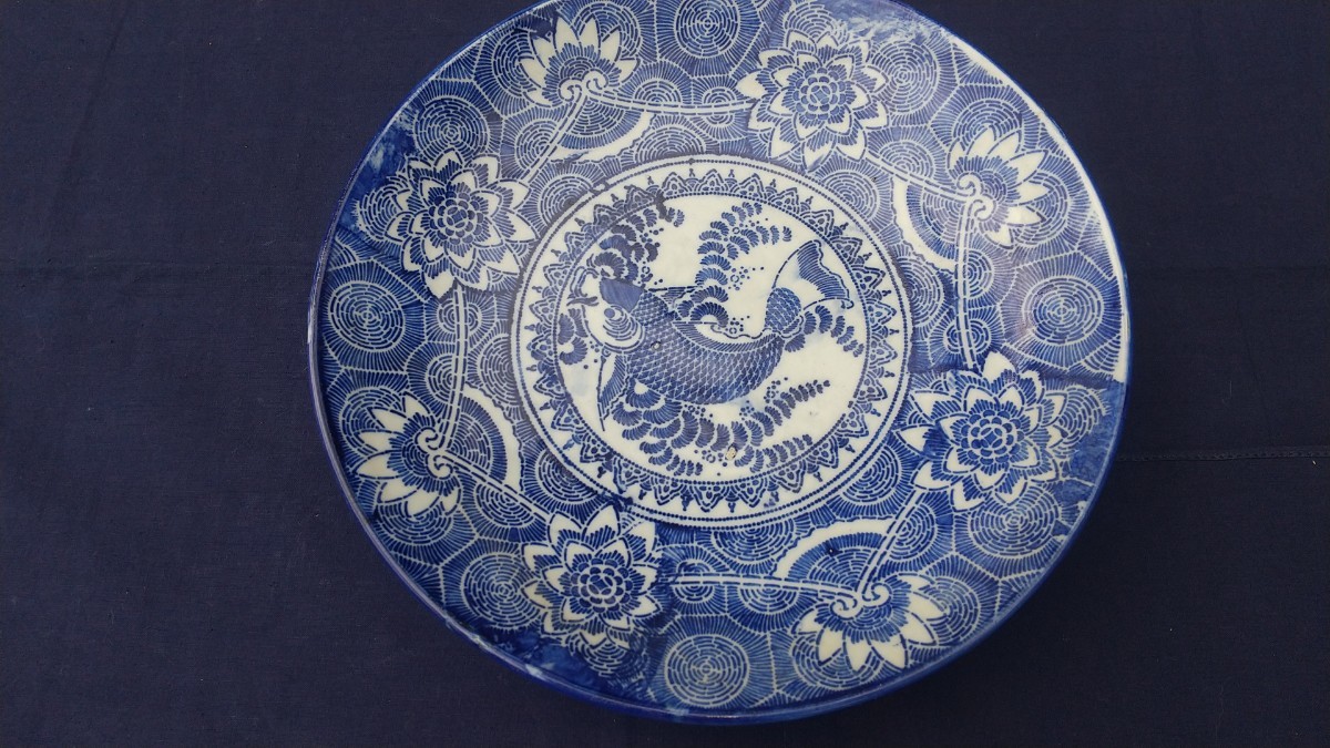 - 明治期 ベロ藍印判手 鯉文 中皿26cm