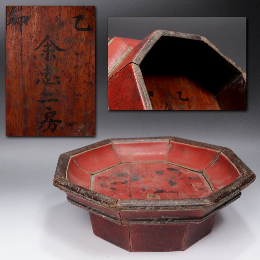 - 《源》【即決・送料無料】《18世紀》《清朝期》余忠二房 墨書入 朱塗 箔絵 人物図 寄木 八角高台盆・菓子器