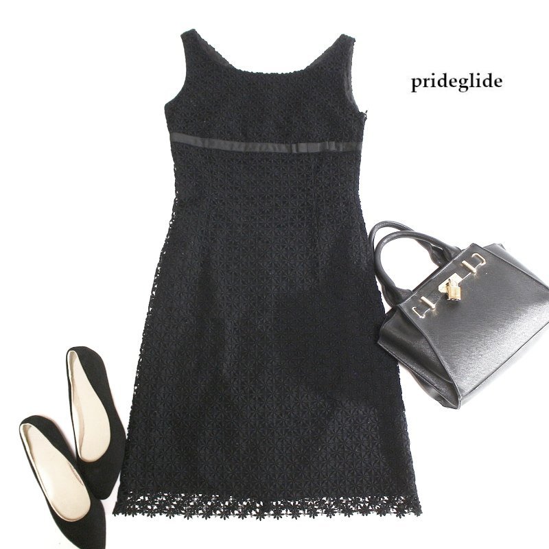 > 美品 プライドグライド prideglide 春 夏 総レースワンピース ノースリーブワンピース 36 7号 ブラック 黒 タイト 綺麗め フォーマル