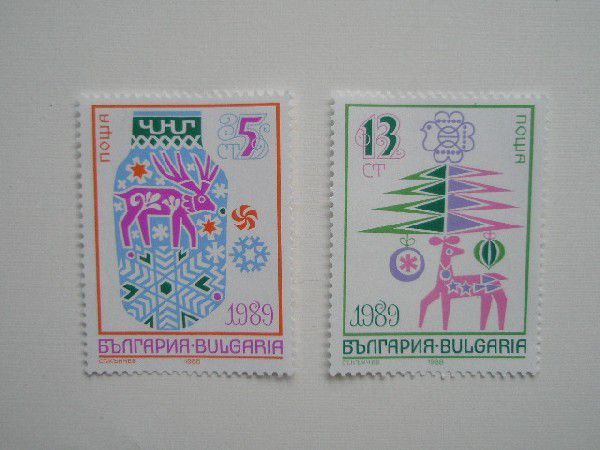13st.:雌鹿とクリスマスツリー、ツリーの上には「国際切手収集展・ブルガリア’89」のエンブレム