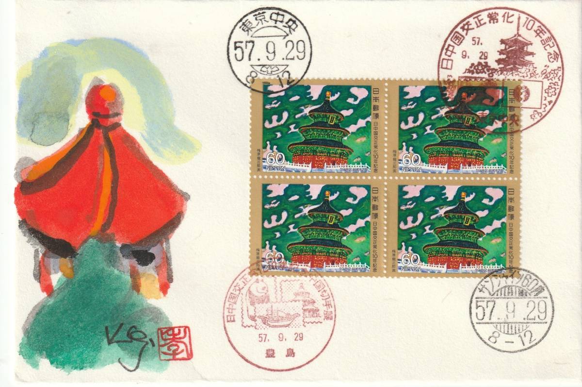 - FDC 1982年 日中国交正常化10年記念 60円4貼4消し 肉筆藤井孝次郎