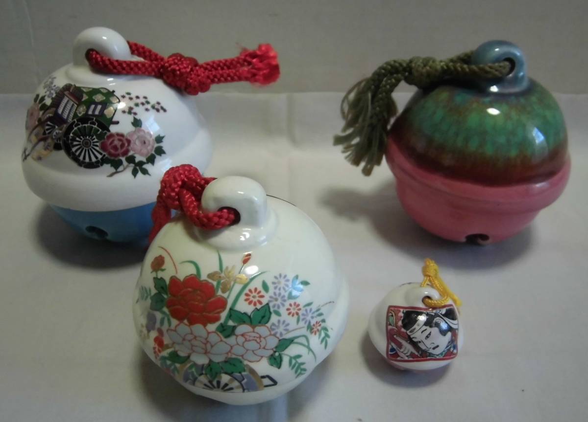 - 土鈴 置鈴 大小 計4点 色絵 金彩 伝統工芸品 郷土玩具 開運 縁起物 置物 飾り物 陶器 レトロ